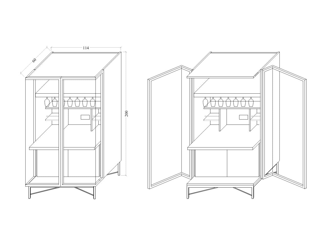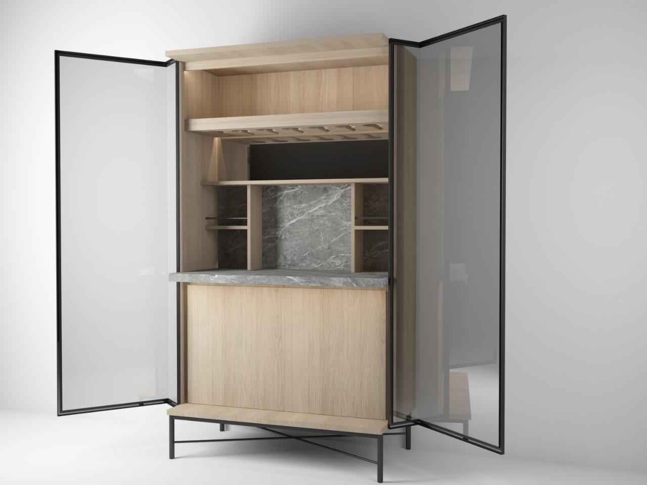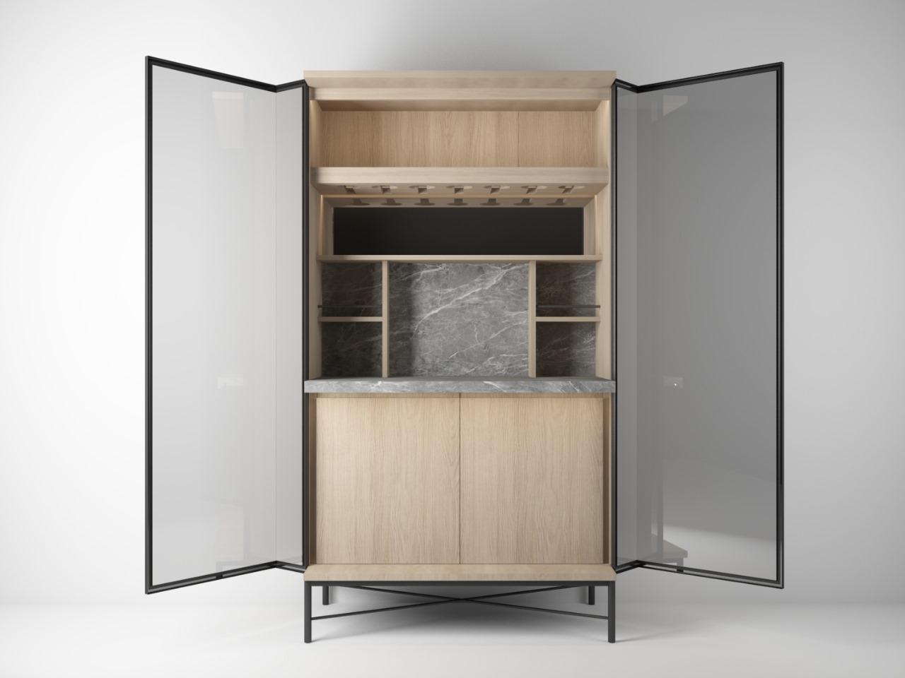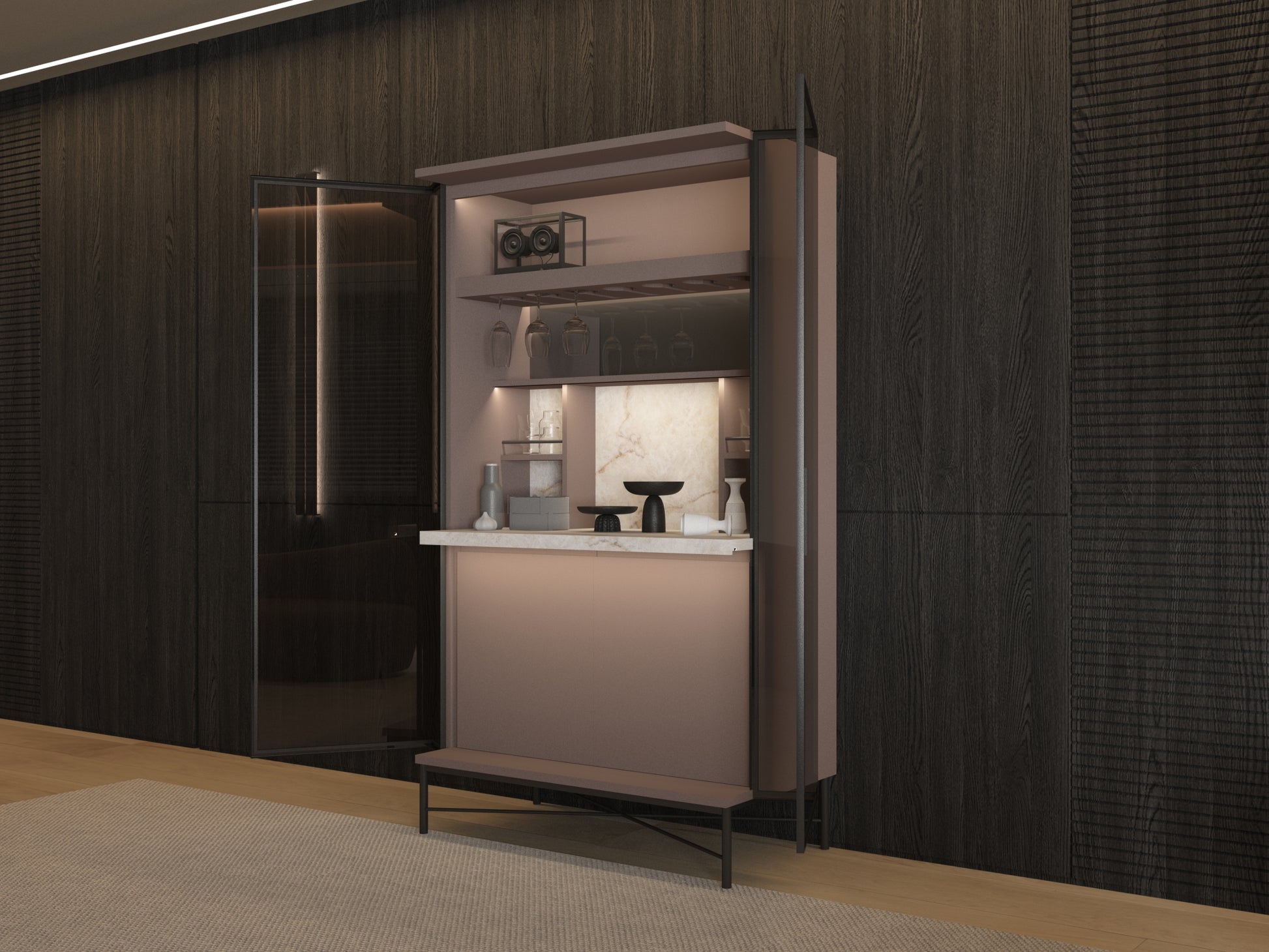 Host beautifully without the clutter. The AFTER HOURS is a two-door bar cabinet that organises bottles, glassware, and tools behind elegant doors, with a dedicated hanging rack for wine and cocktail stems. The central shelf is perfect for mixing; the side cubbies hold bitters and small bottles; the tall bay fits your favourite magnums.
