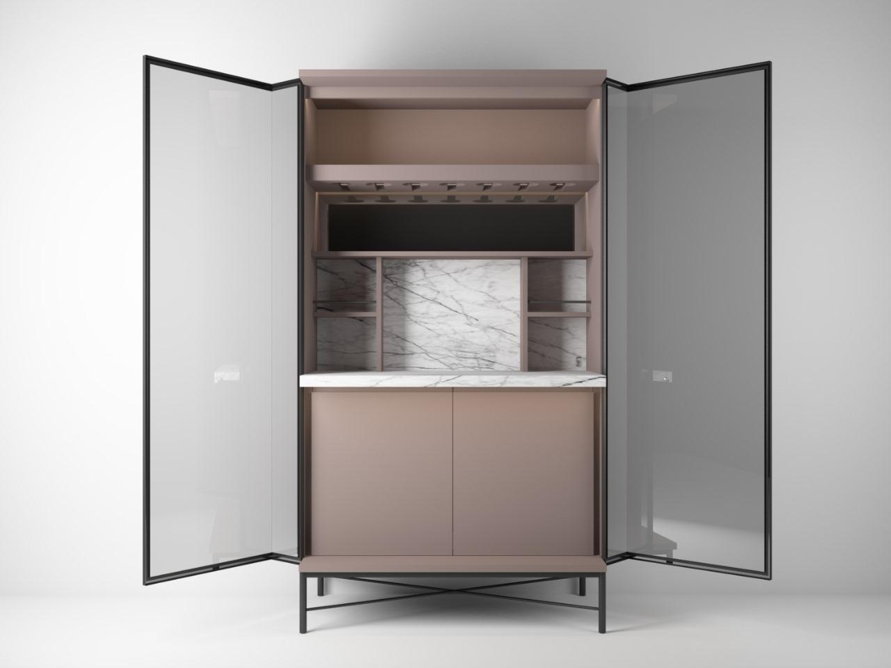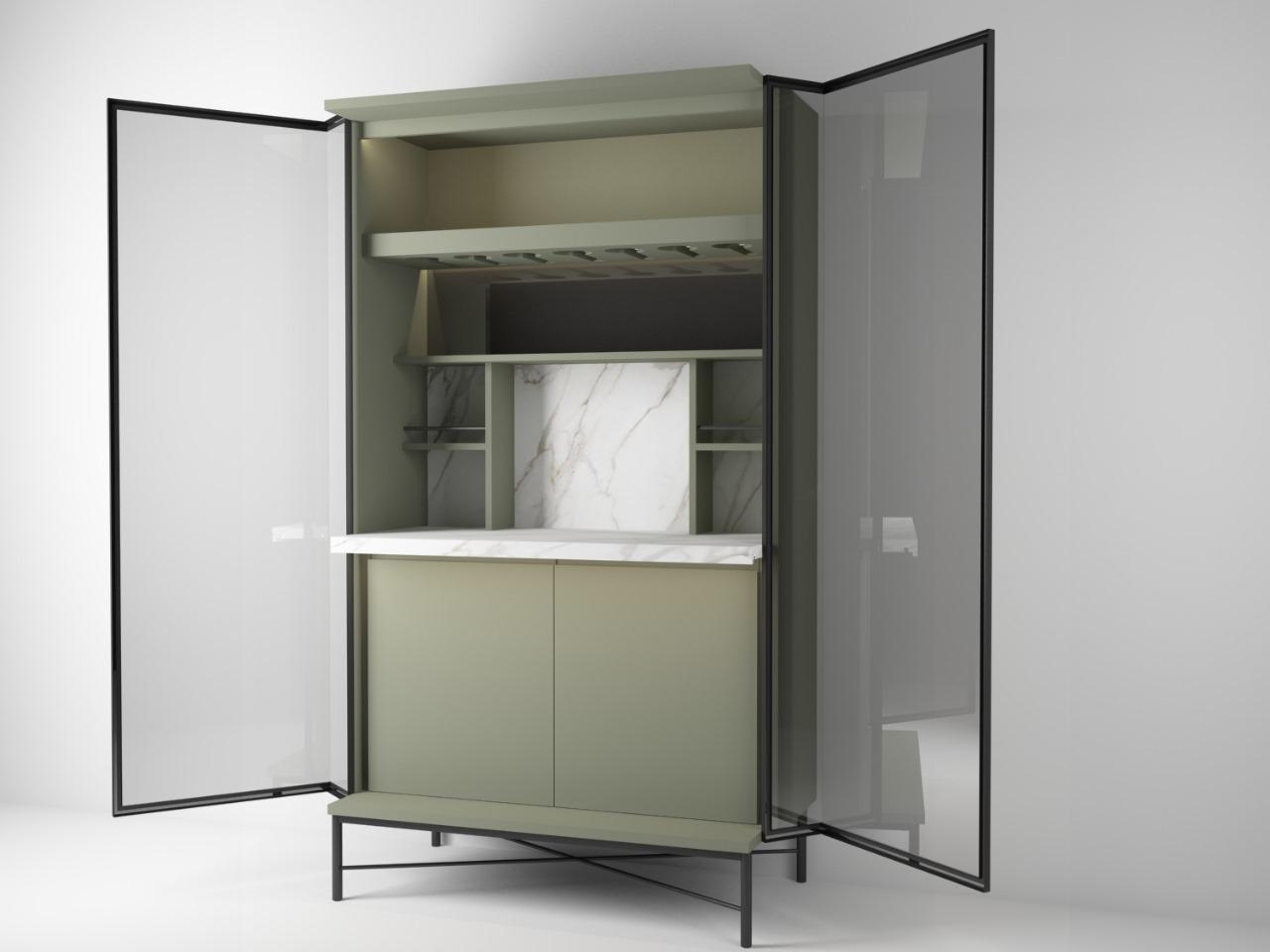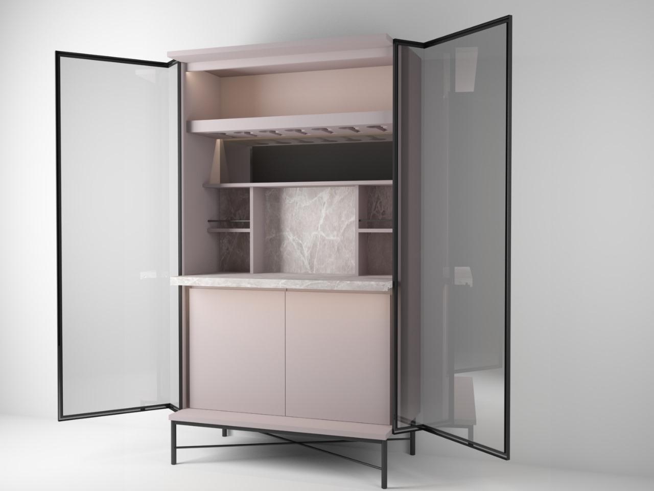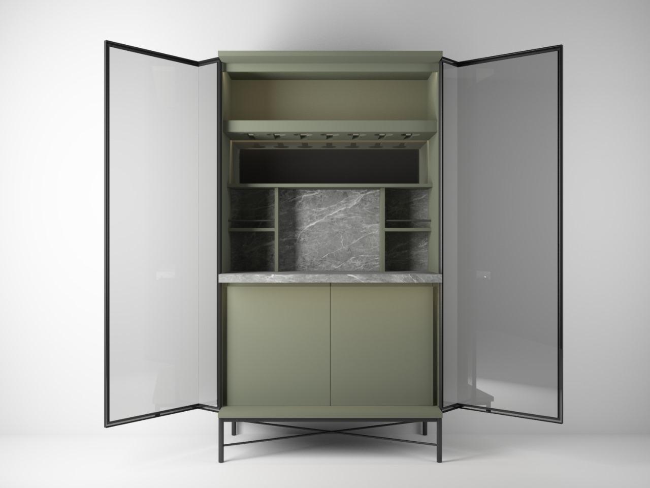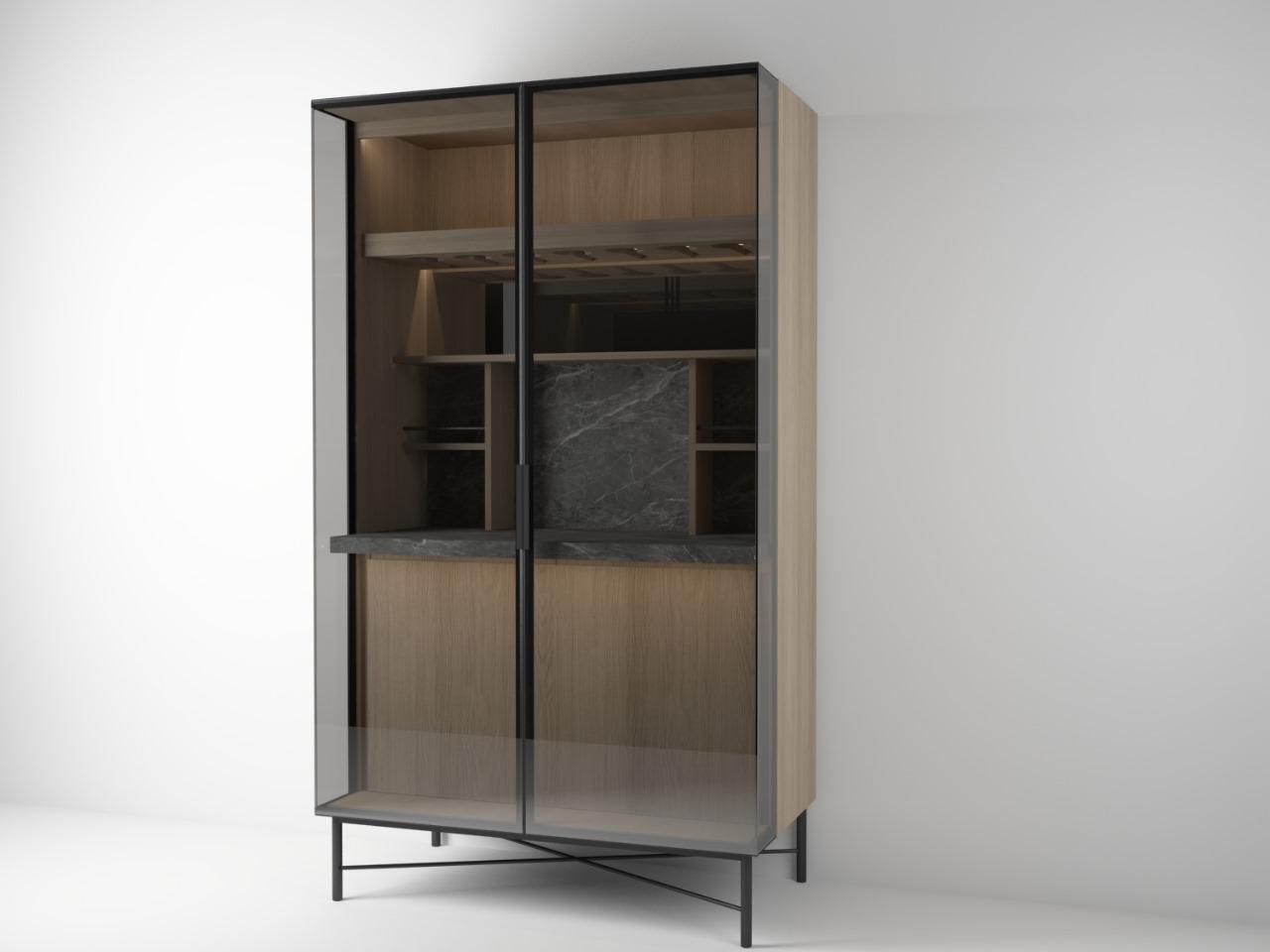 Host beautifully without the clutter. The AFTER HOURS is a two-door bar cabinet that organises bottles, glassware, and tools behind elegant doors, with a dedicated hanging rack for wine and cocktail stems. The central shelf is perfect for mixing; the side cubbies hold bitters and small bottles; the tall bay fits your favourite magnums.